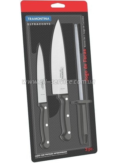 Набір з 2-х ножів та мусату Tramontina Ultracorte (23899/ 072) - практичний та зручний комплект з двох ножів та пристосування для виправлення леза - мусата. У нього входить обробний ніж із довжиною леза 152 мм та кухарський ніж – 178 мм відповідно. Наявність мусату дозволить вам працювати... | 1044 Оптовая цена: 994.00 | ||