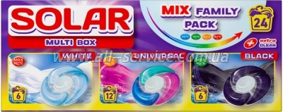 Капсулы для стирки Solar Household Multi Box White + Universal + Black 24 шт. (4820269930391) : 450224 Капсули призначені для ефективного прання білих, темних та універсальних речей. У наборі 24 капсули трьох типів: Білі — забезпечують глибоке очищення світлих тканин, зберігають білизну і не допускають посіріння речей.Темні — зберігають насиченість кольору, не допускають вицвітання... | 262.00 Оптовая цена: 243.00 | ||