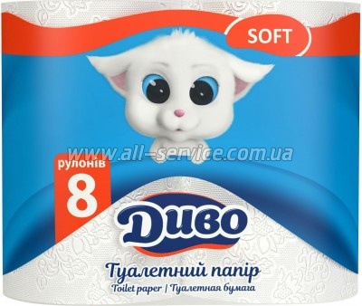 | Туалетная бумага Диво Soft 2 слоя белая 8 рулонов (4820003833292) Туалетная бумага Диво Soft изготовлена из стопроцентной целлюлозы. Обладает мягкостью и прочностью. Имеет 2 слоя.Состав: целлюлоза 100% Производитель: ЧАО Киевский картонно-бумажный комбинат Срок годности: без ограничения Рулон с гильзой Хранить в сухом месте | 156 безнал с НДС: 156 | |
