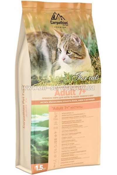 Преміум корм ТМ Carpathian Pet Food «Adult 7+» для котів та кішок похилого віку (старше 7 років). У порівнянні з кормами для котів та кішок молодшого віку, корм «Adult 7+» розроблений зі зменшеною кількістю білків та жирів, що допомагає попередити ожиріння та полегшує роботу нирок. Вміст у кормі... | 246 безнал с НДС: 246 | ||