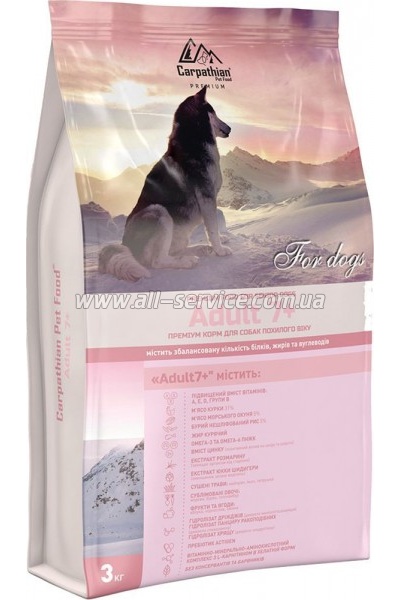 | Сухой корм для собак Carpathian Pet Food Adult 7+ 3 кг (4820111140886) : 424781 Гарантия: 9445 (мес.) Преміум корм ТМ Carpathian Pet Food «Adult 7+» для собак похилого віку (старше 7 років). У порівнянні з кормами для собак молодшого віку, корм «Adult 7+» розроблений зі зменшеною кількістю білків та жирів, що допомагає попередити ожиріння та полегшує роботу нирок. Вміст у кормі L-карнітину... | 407 безнал с НДС: 407 | |