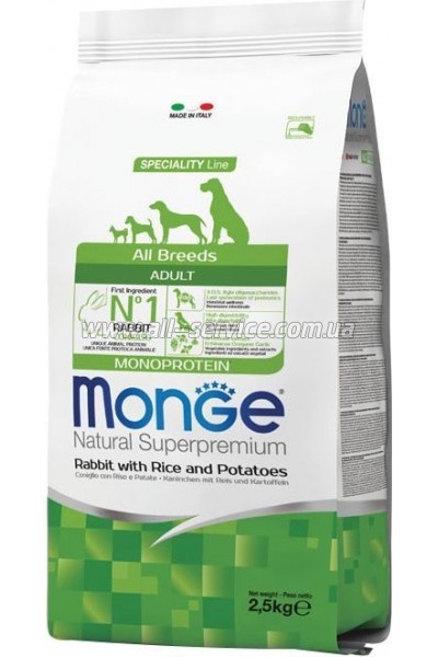 Сухой корм для собак Monge Dog All breeds Adult со вкусом кролика и риса 2.5 кг (8009470011143) : 445728 Monge Natural Superpremium All Breeds Adult Rabbit, Rice & Potatoes - це повноцінний збалансований раціон для дорослих собак всіх порід з особливими потребами. До складу входять добірні гіпоалергенні джерела білку тваринного походження, що дозволяє легко виключити з раціону інгредієнти, які... | 1130 безнал с НДС: 1130 | ||