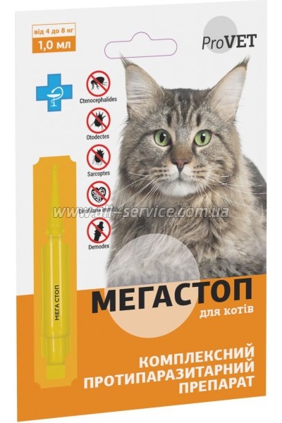 | Капли для животных ProVET Мега Стоп от паразитов для кошек от 4 до 8 кг 1 мл (4823082417469) Препарат має високу ефективність до ектопаразитів, зокрема, бліх та кліщів (отодектозних, саркоптоїдних, нотоедрозних, демодекозних), і ендопаразитів: нематод, дирофілярій (ефективний проти личинок L3 і L4 стадії). До складу препарату входить імідаклоприд, який діє на нервову систему... | 61.00 безнал с НДС: 61.00 | |