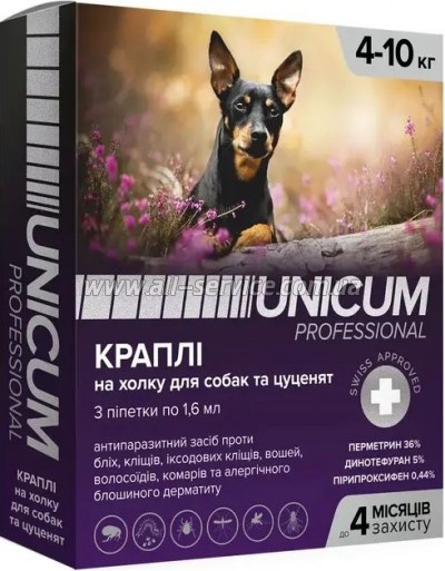 | Капли Unicum Pro от блох вшей волосоедов комаров москитов иксодовых клещей для собак 4-10 кг/ 3 шт (4820150206529) Unicum Pro входит в группу инсектоакарицидных препаратов для наружного применения.Динотефурон – производное от гуанидина, относится к нейротоксинам класса неоникотиноидов, влияет на постсинаптические ацетилхолиновые рецепторы нервной системы, вызывая гибель насекомых.Пирипроксифен - аналог... | 187.00 безнал с НДС: 187.00 | |