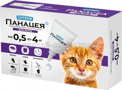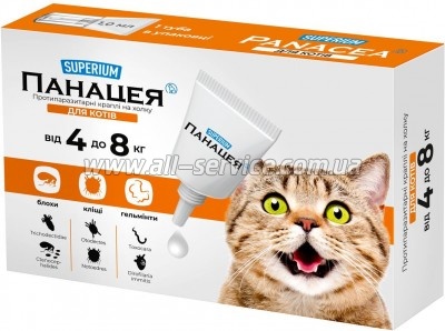 | SUPERIUM Панацея – протипаразитарні краплі на холку для котів. Захист від 22 видів паразитів. Призначені для лікування та профілактики кішок при ураженнях гельмінтами (нематодами та личинками дирофіларії), блохами, вошами, волосяними кліщами, вушними та підшкірними кліщами. Склад (1 мл):... | 157 безнал с НДС: 157 | |