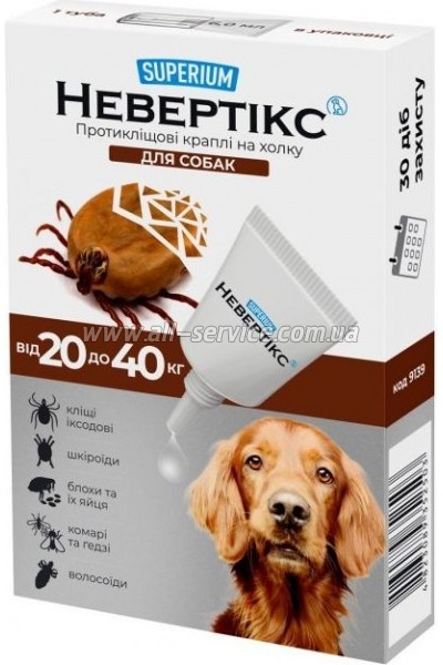 | Капли Superium Nevertix Противоклещевые для собак от 20 до 40 кг (9139) SUPERIUM Невертикс – краплі на холку для собак, які запобігають впливу всіх видів кліщів, бліх та комах. Склад (1 мл): перметрин – 25%, імідаклоприд – 5%, пірипроксифен – 0.3%. Допоміжні речовини: каприловий тригліцерид, агідол, лимонна кислота, ПЕГ-400, N-метилпіролідон. Застосування. Лікування... | 211 безнал с НДС: 211 | |