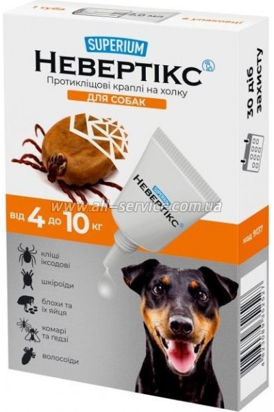 | Капли Superium Nevertix Противоклещевые для собак от 4 до 10 кг (9137) SUPERIUM Невертикс – краплі на холку для собак, які запобігають впливу всіх видів кліщів, бліх та комах. Склад (1 мл): перметрин – 25%, імідаклоприд – 5%, пірипроксифен – 0.3%. Допоміжні речовини: каприловий тригліцерид, агідол, лимонна кислота, ПЕГ-400, N-метилпіролідон. Застосування. Лікування... | 162 безнал с НДС: 162 | |