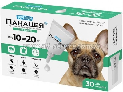 | Капли Superium Панацея Противопаразитарные для собак 4-10 кг (9142) СУПЕРІУМ Панацея протипаразитарні краплі для собак від 4 до 10 кг. Захист від 26 видів паразитів. Препарат ефективний для лікування та профілактики при ураженні вушним та підшкірними кліщами, блохами та їх личинками, вошами, волосоїдами, гельмінтами (нематодами). 30 діб захисту. Діючі речовини:... | 188 безнал с НДС: 188 | |